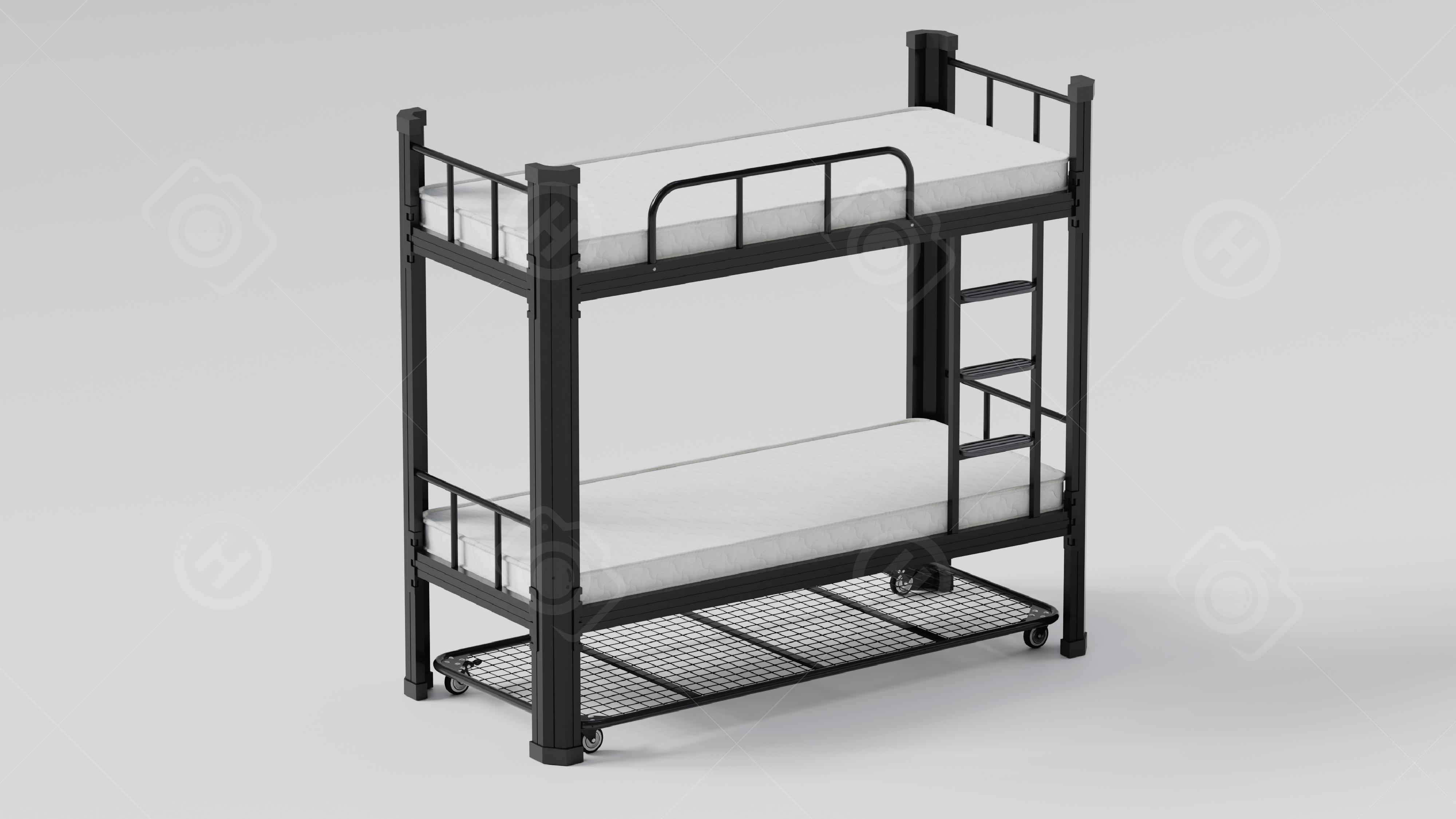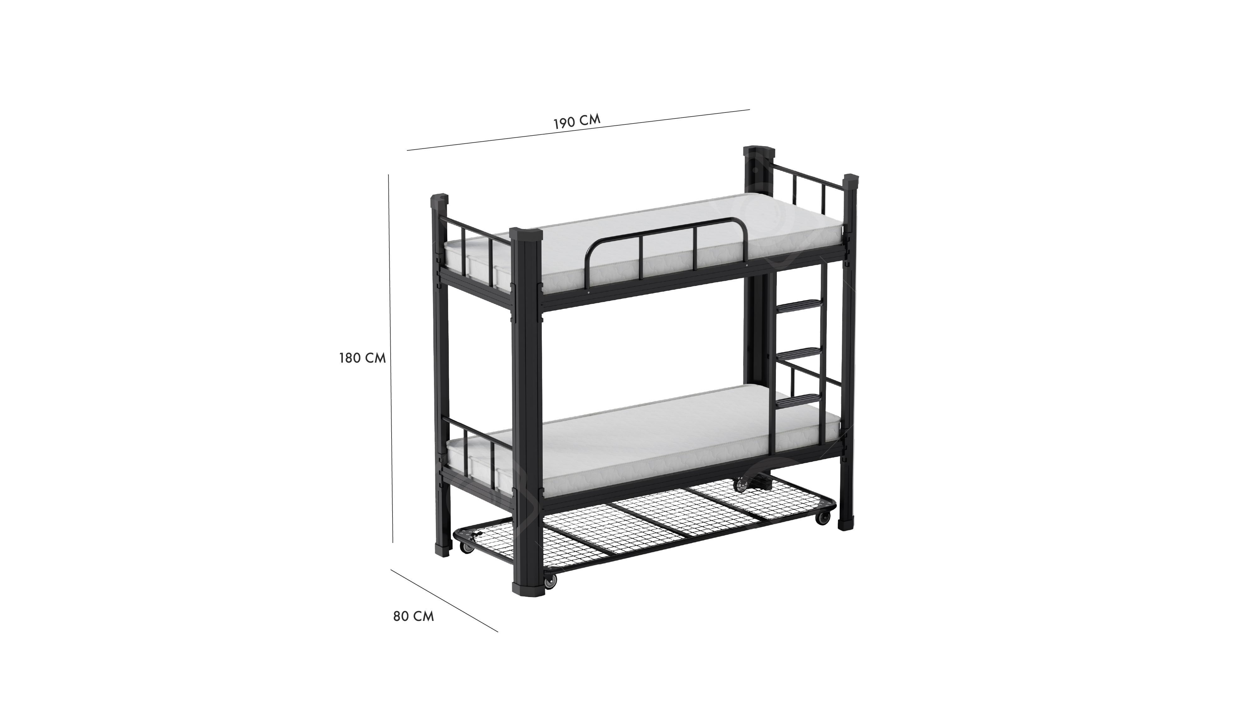Sturdy and durable metal bunk bed designed to provide high comfort and safety. Features an easy-to-pull drawer that can hold an additional mattress to increase sleeping space or for practical use. Ideal for children or small spaces, it is easy to clean and rust-resistant.