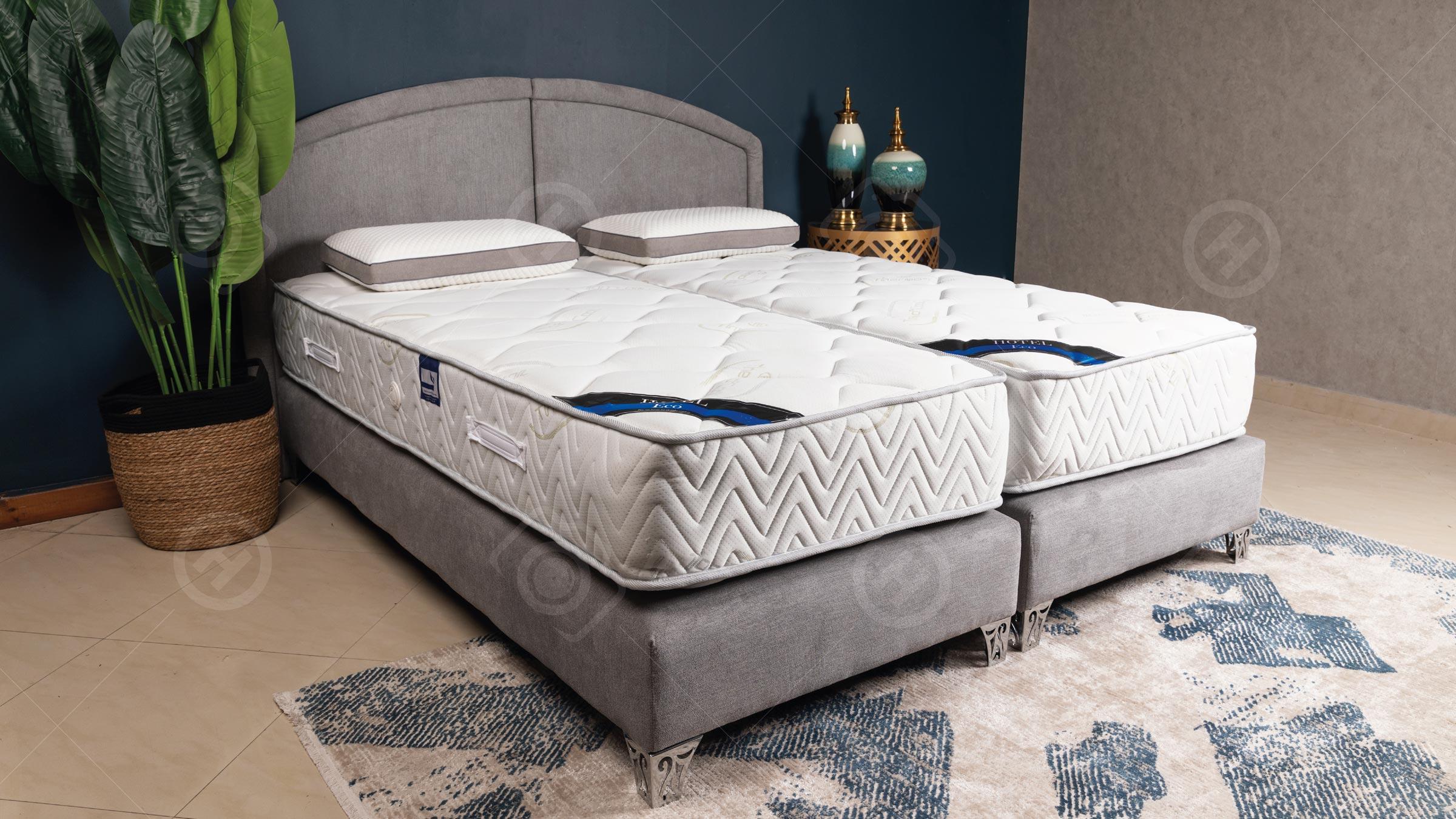 An innovative, practical, easy and convenient system where you can order a bed with a headboard two pices and a detachable box.
